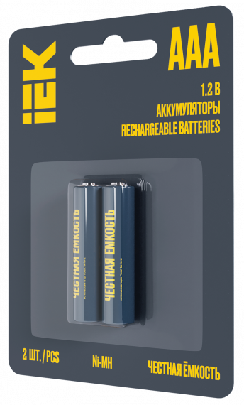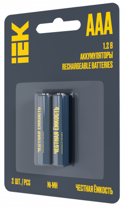 Аккумуляторы мизинчиковые никель-металлогидридные IEK Ni-MH AAA / HR03 1100 мАч, 2 шт. на блистере. Аккумуляторы IEK «Честная ёмкость» производятся в соответствии с международным стандартом IEC и проходят двойной контроль качества каждой партии. Выбирая аккумуляторы, вы заботитесь об экологии. Их цикл использования дольше, а значит, нужно реже искать места утилизации. Предназначены для использования в фотоаппаратах, фонарях, микрофонах, игрушках и других приборах с высоким энергопотреблением. После покупки важно сначала разрядить аккумулятор до конца, а только после этого снова зарядить. Новые аккумуляторы имеют неполный заряд. Для выхода новых аккумуляторов на полную ёмкость может потребоваться до 3-5 циклов разряда-заряда. Соответствуют ГОСТ 12.2.007.12-88, ГОСТ Р МЭК 62133-1-2019 (IEC 62133-1-2017).