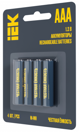 Аккумуляторы мизинчиковые никель-металлогидридные IEK Ni-MH AAA / HR03 1100 мАч, 4 шт. на блистере. Аккумуляторы IEK «Честная ёмкость» производятся в соответствии с международным стандартом IEC и проходят двойной контроль качества каждой партии. Выбирая аккумуляторы, вы заботитесь об экологии. Их цикл использования дольше, а значит, нужно реже искать места утилизации. Предназначены для использования в фотоаппаратах, фонарях, микрофонах, игрушках и других приборах с высоким энергопотреблением. После покупки важно сначала разрядить аккумулятор до конца, а только после этого снова зарядить. Новые аккумуляторы имеют неполный заряд. Для выхода новых аккумуляторов на полную ёмкость может потребоваться до 3-5 циклов разряда-заряда. Соответствуют ГОСТ 12.2.007.12-88, ГОСТ Р МЭК 62133-1-2019 (IEC 62133-1-2017).