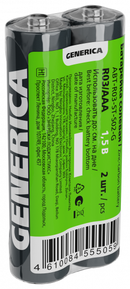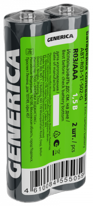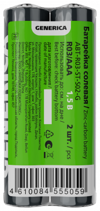 Батарейки солевые мизинчиковые GENERICA AAA / R03, 2 шт. в пленке. Солевые батарейки гораздо доступнее щелочных. Они предназначены для устройств с небольшим энергопотреблением: настенных часов, пультов дистанционного управления, радиоприёмников, счётчиков газа и воды и других подобных приборов. Соответствуют ГОСТ 12.2.007.12, ГОСТ 24721, ГОСТ Р МЭК 60086-1 (IEC 60086-1), ГОСТ 2583-92.