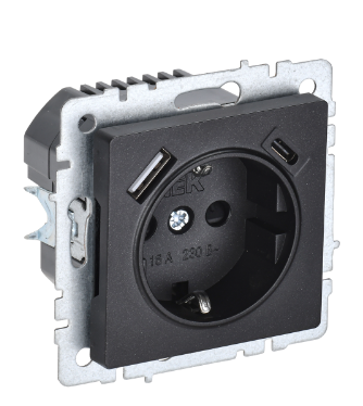 IEK BRITE Розетка 1-местная с заземлением с защитными шторками 16А с USB A+C 18Вт РЮш11-1-БрЧ черный BR-R14-16-U22-018-K02