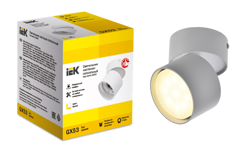 При выборе светильников направленного света IEK® для оформления помещения вы сможете избавиться от визуального шума. Даже небольшая комната не будет перегруженной и сохранит ощущение воздушности. Кроме того, можно настроить световой декор под себя: изменить угол наклона плафона, повернуть рассеиватель или выбрать мощность и цветовую температуру источника света с помощью сменной лампы с цоколем GX53 (в комплект не входит). А для быстрого завершения проекта в этой серии можно найти потолочные модели на 1, 2 или 4 плафона, а также настенные - с кнопкой включения на корпусе.